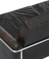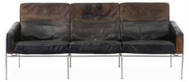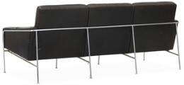 “Lufthavnssofa”. Tre-pers. sofa med stel af forkromet stål. Sæde, sider og ryg betrukket med mørkebrunt skind. Model 3303. Formgivet 1956. Udført hos Fritz Hansen, 1989. H. 73. L. 180. B. 73.