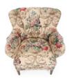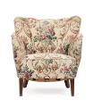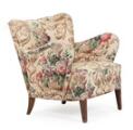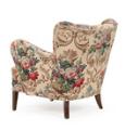 Easy chair with dark stained wooden legs, upholstered with flowered fabric. 1940s.