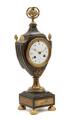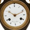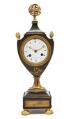 Fransk senempire vaseur af patineret og forgyldt bronze, skive af hvid emalje. Sign. Jeannin á Paris. 19. årh.s begyndelse. H. 42. B. 14. D. 12.
