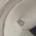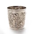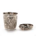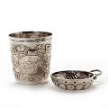 “Winetaster” af sølv, hank i form af slange, samt barokform bæger af hammerslået metal, dekoreret med bladværk, frugter og sløjfer samt felt med graveret hus i landskab. Utydelig og uidentificerede mærker. H. 8 cm. Diam. 7,5 cm. Vægt 135 gr. (2).