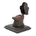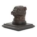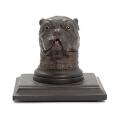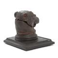 A painted and partly painted metal inkwell in shape of a dog head with glass eyes and liner, wooden tray. 19th-20th century. H. 13 cm. Tray 15×13 cm.