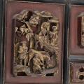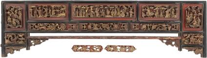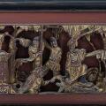A large Chinese giltwood and red-painted panel carved with figural sceneries, Qing circa 1900. 197×55 cm. Further, two small carvings H. 31 cm. (3)