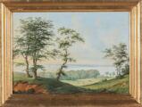 A Danish summer landscape with a view to Aarhus town seen from Højbjerg. Signed with monogram, dated 46. Oil on metal. 18×25 cm.
