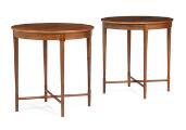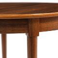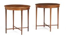 Et par cirkulære sideborde af riopalisander, opsat på runde, tilspidsede ben hvorimellem profileret krydssprosse. Udført ca. 1950'erne hos snedkermester A.J. Iversen, ene med etiket herfra. H. 58. Diam. 55. (2)