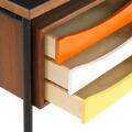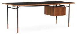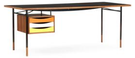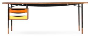 “Nyhavn”. Skrivebord med ben af sortlakeret stål, “sko” og kant af valnøddetræ. Top med sort linoleum. Skuffekassette med tre skuffer, bemalet hvid, orange og gul. Bord formgivet 1945. Skuffekasette formgivet 1953. Udført og mærket for House of Finn Juhl. H. 73. L. 190. B. 85.
