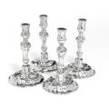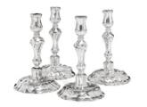 A set of four Danish Rococo silver candlesticks, of spiral-fluted shape, baluster stem, domed-circular and profiled-lobed base, throughout chased and embossed with flowers and foliage, rocailles and shell ornamentation. Maker Sivert Thorsteinsson 1758, Copenhagen town mark 1759. Weight 1,612 g. H. 20 cm. (4)