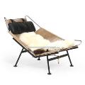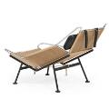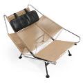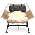 “Flaglinestolen”. Hvilestol med understel af sortlakeret stål. Overstel af forkromet stål, udspændt med flagline. Nakkepude betrukket med sort uld. Sort/hvidt lammeskind medfølger. Model GE 225. Formgivet 1950. Udført 1950–1960'erne hos Getama.