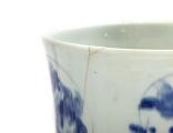 Skade og længere revne på hals samt mindre kanthak. Revne under bund. Større afskalninger på lak.
