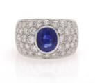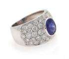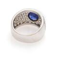 Safir- og diamantring af 18 kt. rhodineret guld prydet med oval facetslebet safir på ca. 2.80 ct. omkranset af talrige brillantslebne diamanter på i alt ca. 2.50 ct. B. ca. 1,4 cm. Str. ca. 55.