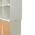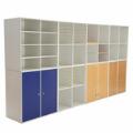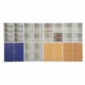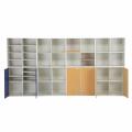 “Montana”. A light grey MDF wall unit, comprising five bookcases and three cabinets with resp. blue MDF and beech doors. Three loose beech shelves included. Manufactured by Montana. H. 70 cm. W. 70 cm. D. 38 cm. (8)