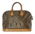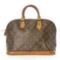 An “Alma” bag of brown monogram canvas with brown leather trimmings, gold tone hardware, two handles, one zipped compartment with one interior pocket and brown fabric lining. Accompanied by padlock without keys. H. 25 x W. 33 x D. 16 cm. 1994.