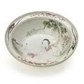 A Chinese enamelled porcelain wash basin painted with a reading woman on a garden terrace, late Qing/Republic. Diam. 28 cm.