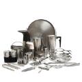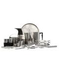 Fish dish with grate, thermo, coffee pot, tea pot, cocktailshaker, fondue set with two forks, ashtray, plat de menage, two sets of salad servers, corkscrew, three ice tongs, cake server, two roasting forks, grill tong and a salad spoon.