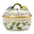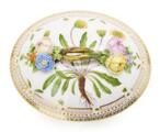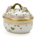 “Flora Danica” porcelain sugar bowl with cover decorated in colours and gold with flowers. 3582. Royal Copenhagen. H. 14 cm. L. 15,5 cm.