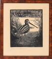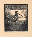 En sneppe ved en søbred. Signeret Johannes Larsen. Træsnit. Lysmål 31×27 cm.