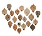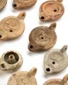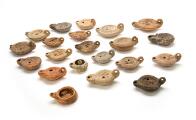 En stor samling romerske olielamper af terracotta, diskus med motiver af dyr, gudinder f. eks. Diana på hjort, dagligliv mm. 12 mærket med værksted: MNOVIVSTI, CCORVUS, LCAPR, LMADIEC. Nordafrika mm. 2.-3. årh. e. Kr. Samt to tidligere græske lamper, 4.-3. årh. f. Kr. L. 7–14 cm. (21)
