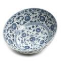 Kinesisk bowle af porcelæn, dekoreret i blåt med blomsterslyng. På stand af træ. Ming stil. 20. årh. H. 17. Diam. 41 cm. (2)