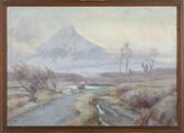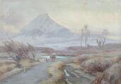 Vandrende i et bjerglandskab. Sign. Hugo V. P. Olie på lærred. 70×99.