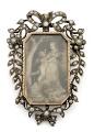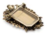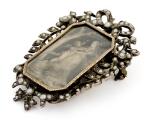 A pearl brooch/pendant in the shape of a locket set with numerous seed pearls, mounted in gold and silver. Weight app. 21 g. incl. glass. App. 5.3×3.6 cm.