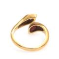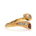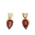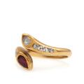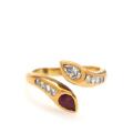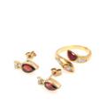 A ruby and diamond ring set with pear-cut ruby and a pear-cut diamond and numerous single-cut diamonds, mounted in 18k gold. And a pair of garnet and diamond earrings each set with pear-.cut garnet and single-cut diamond, mounted in 9k gold. Total weight app. 6 g. Ring size 51. (3)