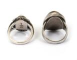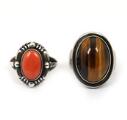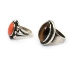 En koralring og en tigerøjering af sterlingsølv prydet med henholdsvis poleret koral og tigerøje. Dessin 1A og 46A. Samlet vægt ca. 15,5 g. Str. 50. (2)