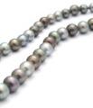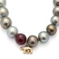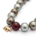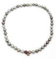 Perlehalskæde i forløb prydet med talrige Tahiti perler og grønlandsk rubinkugle, samt lille charm af 18 kt. rosaguld i form af isbjørn prydet med facetslebet rubin. Perlediam. ca. 7–10 mm. L. 46 cm.
