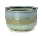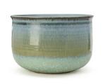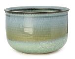 Rund skål af stentøj, dekoreret med blå og grøn glasur med sorte elementer. Stemplet Sommer, Rørvig. Unik. H. 20,5. Diam. 31.
