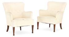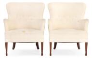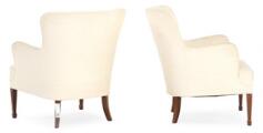 Et par lænestole med ben af mahogni. Sæde, sider og ryg betrukket med lyst stof. Udført hos snedkermester FritsHenningsen. (2)