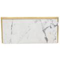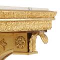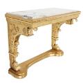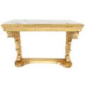 Svensk senempire konsol af forgyldt træ med plade af hvid marmor, sidestykker udskåret med bladværk og dyrepoter. 19. årh.s begyndelse. H. 83. B. 114. B. 52.