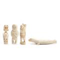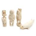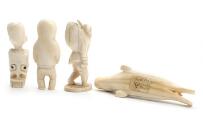 Four Greenlandic carved walrus tusk tupilaks in the shape of fabulous monster, seal and Inuits. One signed J. L. 20th century. H. 3–9.4 cm. L. seal 14 cm. (4)