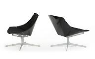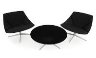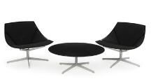 “Space”. A pair of easy chairs with steel swivel frame, black plastic shell, upholstered with black wool and a circular coffee table with glass top. Designed 2007. Manufactured and marked by Fritz Hansen. H. 37. Diam. 100 cm. (3)
