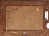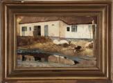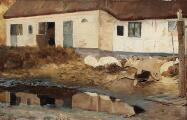 “Svinene på møddingen”. The pigs in the dunghill. Signed and dated Søren Lund 1885. Oil on canvas laid on cardboard. 24.5×38 cm.