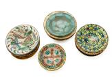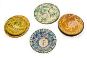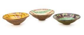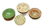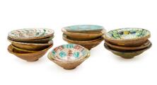 15 skåle af keramik, konveks form på lavt, indtrukket fodstykke, prydede med designs i div. farver, Swat Valley Pakistan, 19/20. årh. Skader. (15)