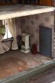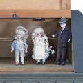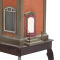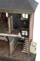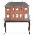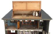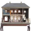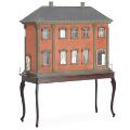 Stort dukkehus af træ i to etager med loft, indeholdende enkelt indbo og opstillet på stand. 20. årh.s begyndelse. H. 86/141 cm. D. 42 cm. B. 116 cm.