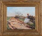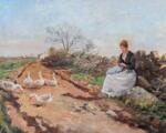 Landscape with a goose girl at a stone wall. Signed and dated Escudier 1895. Oil on panel. 32.5×40.5 cm.