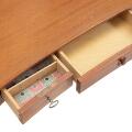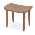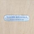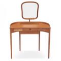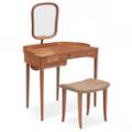 “Birgitta”. Sminkebord af mahogni med skuffer, opbevaringsrum med jalousilåge, samt spejl. Tilhørende skammel med ben af mahogni, sæde betrukket med brun, stribet uld. Udført hos Bodafors. Udgået og mærket hos Illums Bolighus. H. 121. L. 86. D. 51. (2)