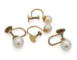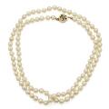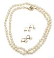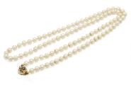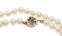 Lang perlehalskæde prydet med talrige kulturperler samt safirlås af 14 kt. guld prydet med facetslebne safirer. Samt to par øreskruer af hhv. 14 og 9 kt. guld prydet med kulturperler. Samlet vægt ca. 39 g. Perle diam. ca. 5–7 mm. Halskæde L. 73,5 cm. (5)