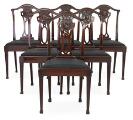 Seks tyske stole af mahogni, gennembrudt ryg og dekoreret med profilportræt og med let tilspidsede kannelerede ben, sæder betrukket med hestehår. Hamburg, 18. årh. (6)