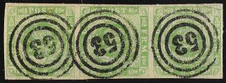 1854. 8 sk. grøn. Smuk 3-stribe, annulleret med nr.stempler 53: RANDERS. Attest Møller [ 5 ] [  ]