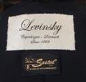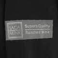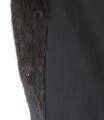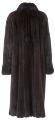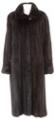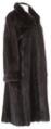 Lang mørkebrun pelsjakke af mink med krave, knap og hægtelukning på front, to lommer og sort stof for. Længde ca. 122 cm, brystmål 110 cm, ærmelængde 62 cm.