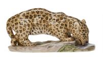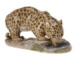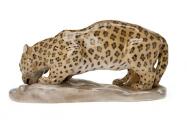 Drikkende leopard. Figur af porcelæn, dekoreret i underglasur farver. 1469. Royal Copenhagen, 1868–1922. L.21 cm. H. 11 cm.
