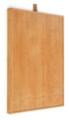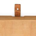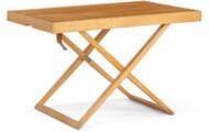 Højdejustérbart foldebord af bøg med top af pæretræ, sammenklappeligt stel samt skindstrop. Model MK-19. Formgivet 1960. Udført hos Rud. Rasmussen Snedkerier, mærket med messingplakette. H. 35/47. L. 71,5. B. 53.