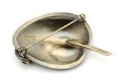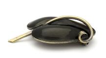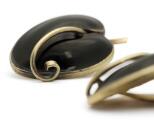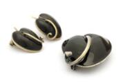 An enamel comprising of a pair of ear clips and a brooch each set with black enamel, mounted in silver. Weight in total app. 19.5 g. Ear clips L. 2.3 cm. Brooch 3×5 cm. (3)