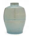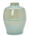 A stoneware vase decorated with transparent light blue glaze. Signed G. Meedom, N.989. Made and marked by Bing & Grøndahl. H. 19.5 cm.