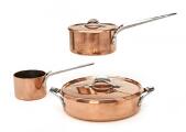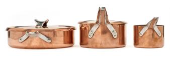 “Taverna”. Three pieces of copper kitchenware with stainless steel handles. Inner surfaces silver plated. Comprising one pot with cover, and two small casseroles, the largest with cover. Marked Georg Jensen Design, Denmark. Diam. 9–19.8 cm. (3)
