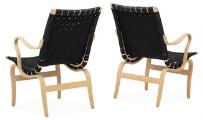 “Eva”. A pair of beech easy chairs. Seat and back with black, woven girths. Manufactured by Dux. (2)