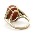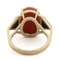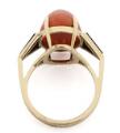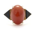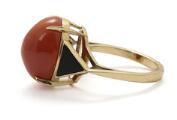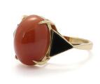 A coral- and onyx ring set with a cabochon coral and polished onyx, mounted in 18k gold. Weight app. 5 g. W. 14.5 mm. Size 52.5.