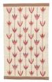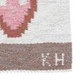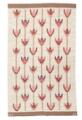 Handwoven wool carpet in “rölakan” flat weave technique. Stylized flower decor in shades of pink and brown on a light base. Signed MS and KH. Made by Klockargårdens Hemslöjd, Tällberg, Sweden, second half of 20th century. L. 208 cm. W. 125 cm.