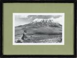 Original black-and-white press photograph of Mount Kilimanjaro in Tanzania (Tanganyika). Back with agency and restriction stamps and stamped dates for newspaper publication (September 15, 1948, December 21, 1950). Black painted wooden frame with double glass. Visible size 12.5×20 cm. Frame size 21×29 cm.