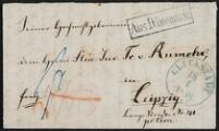1858. Very fine small entire to Leipzig with blue canc. GLUCKSTADT 18.4.1858 (Schleswig) and framed “Aus Dänemark” [ ✉ ]